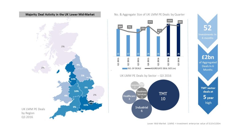 UK Lower Middle Market sees 40 Private Equity investments in the first half of the year with a total value of £1.63bn Significant uplift in activity in the second quarter of the year, with 23 of 40 deals completed in the three months to June Despite heightened market uncertainty in the run up to the UK’s EU referendum, investor appetite for UK-based SMEs in the first half of 2016 was on a par with 2015, signalling that investor confidence is still strong.